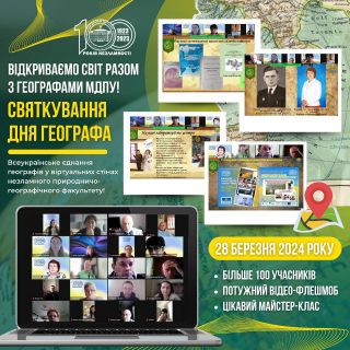28 березня 2024 року кафедрою географії та туризму Мелітопольського державного педагогічного університету імені Богдана Хмельницького було організовано і проведено в онлайн-форматі День географа України.