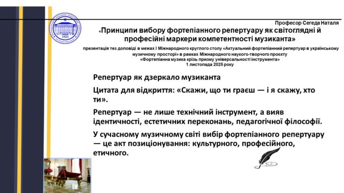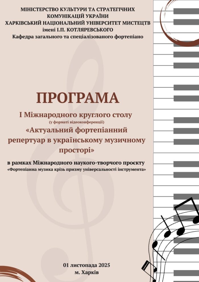 🎓💫 1 листопада 2025 року в рамках Міжнародного науково-творчого проєкту «Фортепіанна музика крізь призму універсальності інструмента» відбувся І Міжнародний круглий стіл (у форматі відеоконференції) «Актуальний фортепіанний репертуар в українському музичному просторі».