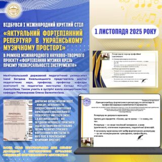 🎓💫 1 листопада 2025 року в рамках Міжнародного науково-творчого проєкту «Фортепіанна музика крізь призму універсальності інструмента» відбувся І Міжнародний круглий стіл (у форматі відеоконференції) «Актуальний фортепіанний репертуар в українському музичному просторі».