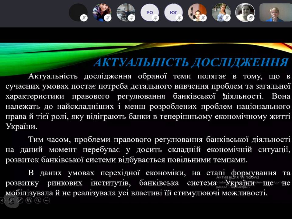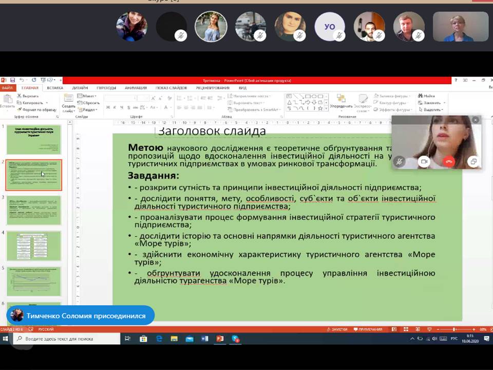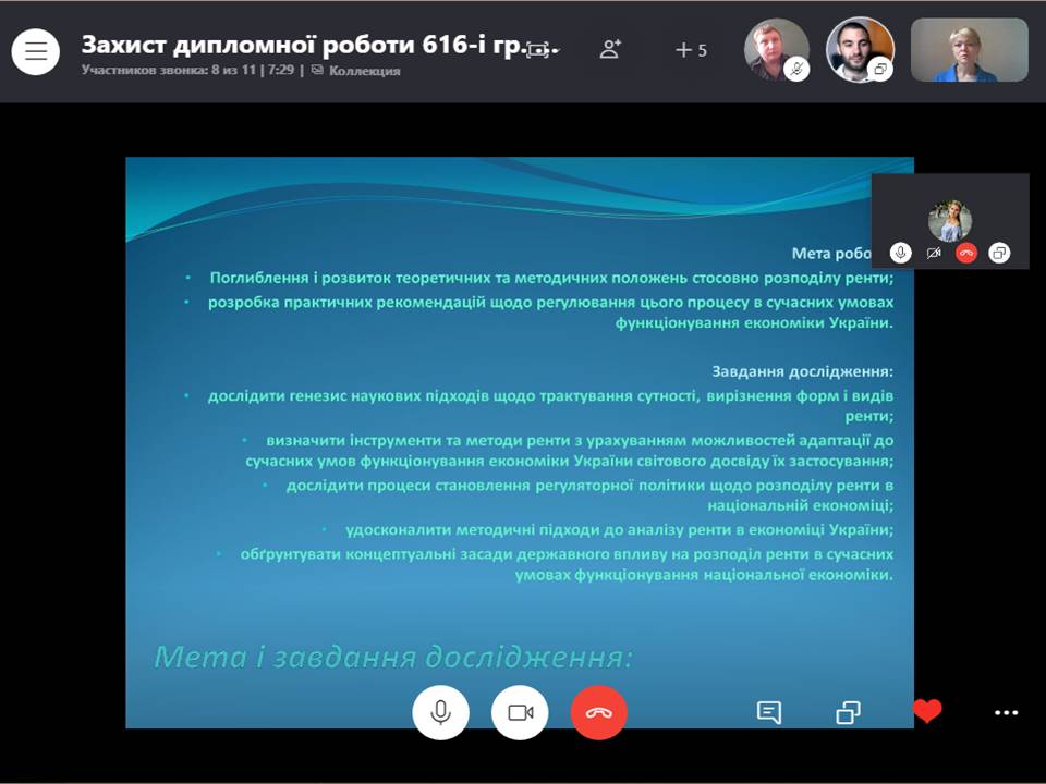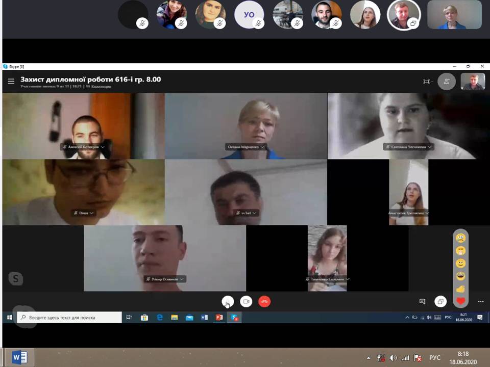 18.06.2020 на платформі Skype в режимі відеоконференції відбулась атестація студентів спеціальності 051 Економіка за освітньо-професійною програмою «Економіка та бізнес» у вигляді захисту кваліфікаційної роботи. Студенти підготували доповіді та презентації з тем дослідження. Кваліфікаційні роботи виконані на актуальні теми, враховуючи сучасні тенденції в економіці, а саме: «Розробка та обґрунтування бізнес-планування на підприємстві ПрАТ «Дніпроспецсталь», «Фінансова політика в закладах ресторанного господарства України», «Бюджетування, як ефективний метод управління підприємством на прикладі ТОВ «Новоолексіївський елеватор», «Кластерний підхід в реалізації державної політики регіонів України», «Сучасний стан банківської системи України», «Фінансове забезпечення розвитку енергетичного сектора України», «Розподіл ренти в національній економіці України» та ін.Екзаменаційна комісія для проведення атестації здобувачів вищої освіти та присвоєння кваліфікації за ступенем вищої освіти бакалавр працювала у складі: голова ЕК Марченко О.А. – д.е.н., завідувач кафедри економіки та готельно-ресторанного бізнесу, члени комісії: Гурбик Ю.Ю. – к.н.держ.упр., старший викладач кафедри економіки та готельно-ресторанного бізнесу, Біляєв С.С. – к.е.н., старший викладач кафедри економіки та готельно-ресторанного бізнесу, Шевчук О.О. – директор туристичного агенства «Мир путешествий», секретар Сальнікова М.В. – старший лаборант кафедри економіки та готельно-ресторанного бізнесу.