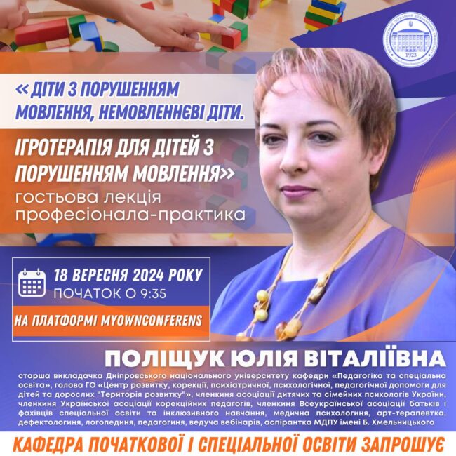 ЗАПРОШУЄМО НА ГОСТЬОВУ ЛЕКЦІЮ ПРОФЕСІОНАЛА-ПРАКТИКА Кафедра початкової і спеціальної освіти запрошує стати учасниками гостьової лекції на тему: «Діти з порушенням мовлення, немовленнєві діти. Ігротерапія для дітей з порушенням мовлення»! Лектор: Поліщук Юлія Віталіївна — старша викладачка Дніпровського національного університету кафедри «Педагогіка та спеціальна освіта», голова ГО «Центр розвитку, корекції, психіатричної, психологічної, педагогічної допомоги для дітей…