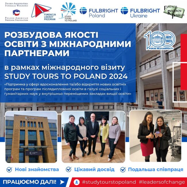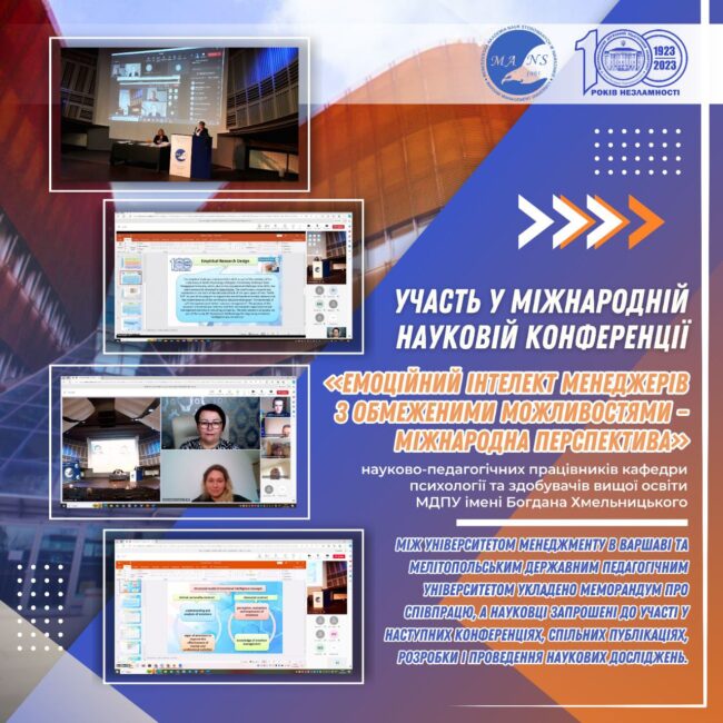 УКЛАДЕНО НОВИЙ МЕМОРАНДУМ ПРО СПІВПРАЦЮ! 21 березня 2024 року науково-педагогічні працівники кафедри психології та здобувачі вищої освіти університету взяли участь у Міжнародній науковій конференції «Емоційний інтелект менеджерів з обмеженими можливостями – міжнародна перспектива». Конференція проходила у змішаному форматі і була організована Університетом Менеджменту в Варшаві (Республіка Польща) спільно з іншими європейськими вишами Болгарії, Греції, Словаччини,…