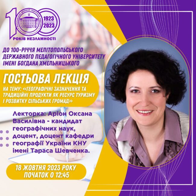 ДО УВАГИ АКАДЕМІЧНОЇ СПІЛЬНОТИ УНІВЕРСИТЕТУ! До 100-річчя Мелітопольського державного педагогічного університету імені Богдана Хмельницького 18 жовтня 2023 року о 12:45 запрошуємо стати учасником гостьової лекції на тему: «Географічні зазначення та традиційні продукти як ресурс туризму і розвитку сільських громад». Лекторка: Аріон Оксана Василівна – кандидат географічних наук, доцент, доцент кафедри географії України КНУ імені Тараса Шевченка.…