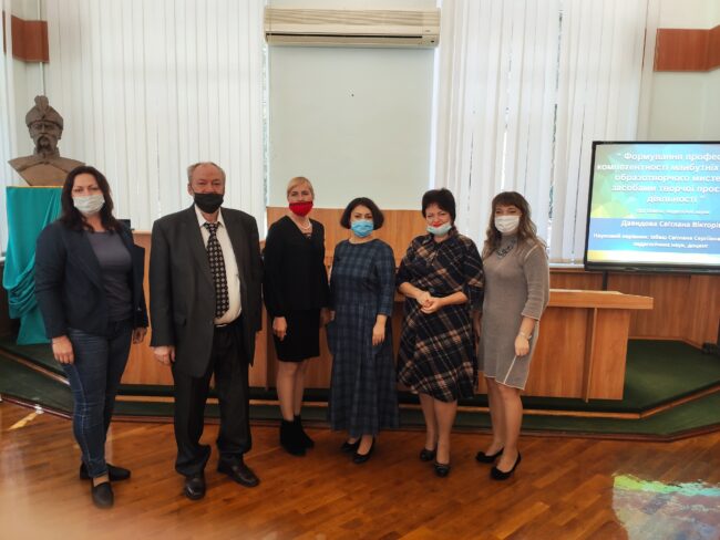 12 жовтня 2020 р. в Мелітопольському державному педагогічному університеті імені Богдана Хмельницького відбувся захист дисертації Давидової Світлани Вікторівни на здобуття наукового ступеня доктора філософії з галузі знань 01 Освіта/Педагогіка за спеціальністю 011 Освітні, педагогічні науки. Тема дисертації “Формування професійної компетентності майбутніх учителів образотворчого мистецтва засобами творчої проєктної діяльності”. Науковий керівник: к.пед. н., доцент Ізбаш Світлана…