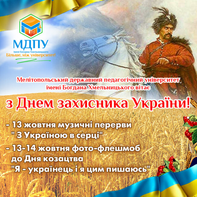 Відділ організаційно-виховної роботи та професійної орієнтації молоді вітає з прийдешнім державним святом – Днем захисника України! Запрошуємо долучитися до святкування, насолодитися музичними перервами українських пісень та взяти участь у фото-флешмобі “Я українець і я цим пишаюсь”. Ділись своїми фотографіями, які відображають любов та повагу до рідної землі та став хештег #українцімдпу. Святкуємо разом з #більшеніжуніверситетом!!