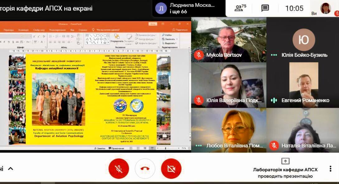 15-16 квітня 2021 року кафедра авіаційної психології Факультету лінгвістики та соціальних комунікацій провела XІІ Міжнародну науково-практичну конференцію «Авіаційна та екстремальна психологія у контексті технологічних досягнень». У форматі онлайн захід відбувся у рамках четвертого Міжнародного симпозіуму «Соціокультурний дискурс глобалізованого світу: наука, освіта, комунікація». Співорганізаторами виступили вищі навчальні заклади з Литви, Польщі, Туреччини, Португалії, Швеції, Швейцарії, Азербайджану та із різних куточків України.