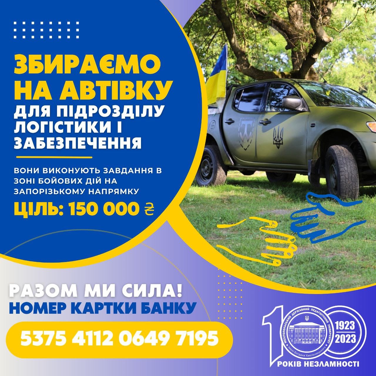 Саме тому, МДПУ імені Богдана Хмельницького ініціює збір на автівку для підрозділу логістики і забезпечення, що виконує завдання в зоні бойових дій на Запорізькому напрямку.