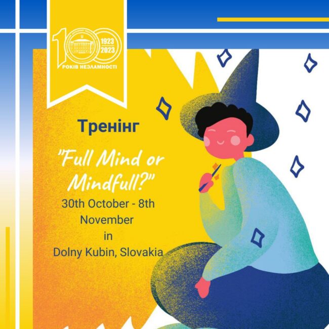 ДО УВАГИ АКАДЕМІЧНОЇ СПІЛЬНОТИ УНІВЕРСИТЕТУ! NGO “Vzayemopomich” шукає 3 учасників(-иць) для участі у тренінгу “Full Mind or Mindfull?”, що відбудеться 30 жовтня – 8 листопада, в Дольний Кубін, Словаччина. Тема тренінгу – усвідомленість, де увага буде зосереджена на вивченні стресу, стрес-менеджменту, тайм-менеджменту та технік MBSR (зменшення стресу на основі усвідомленості). Учасники: 📍 Молодіжні працівники, викладачі,…
