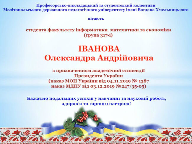 12 грудня 2019 року відбулося засідання круглого столу на тему «Формування професійної мотивації у здобувачів вищої освіти до успішної практичної педагогічної діяльності» у рамках Програми взаємодії Мелітопольського державного педагогічного університету імені Богдана Хмельницького з управлінням освіти Мелітопольської міської ради Запорізької області. Захід проводився для здобувачів вищої освіти педагогічних спеціальностей за участю директора методичного кабінету та…