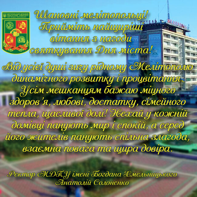 1 жовтня, на базі Мелітопольського державного педагогічного університету імені Богдана Хмельницького відбулось чергове засідання Ради ректорів закладів вищої освіти Запорізького регіону. Ректор університету Анатолій Солоненко акцентував увагу на тому, що місто Мелітополь багато в чому схоже на інші українські міста: історично багатонаціональне і з успішним промисловим минулим. Ще однією важливою демографічною особливістю Мелітополя є те,…