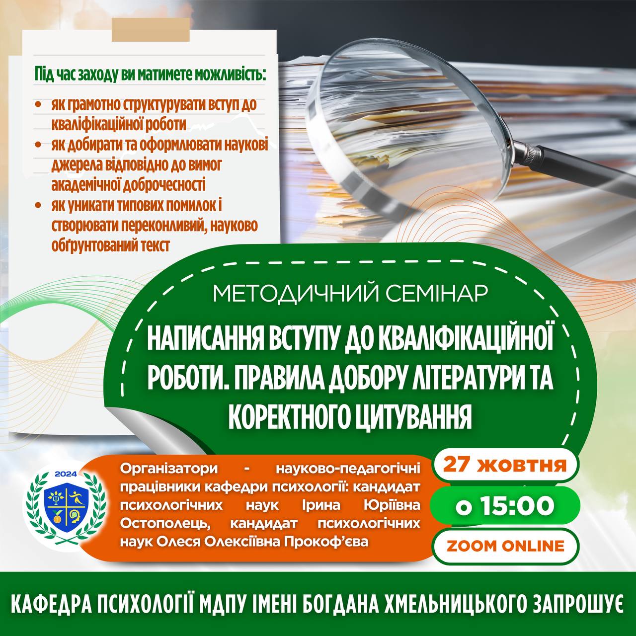 📚🚀Кафедра психології МДПУ імені Богдана Хмельницького запрошує студентів спеціальності “Психологія” стати учасниками методичного семінару «Написання вступу до кваліфікаційної роботи. Правила добору літератури та коректного цитування». 📆✅ Захід відбудеться 27 жовтня 2025 року о 15:00 у віртуальному залі Zoom-відеоконференції 🔗https://us02web.zoom.us/j/4604359994?pwd=Nmd6UWMydFhqZ2tuZkorM3J1MG1WZz09&omn=88508471486🔺Ідентифікатор конференції: 460 435 9994🔺Код доступу: 123 Відеозапис буде розміщений за посиланням: https://fvsp.mdpu.org.ua/kafedra-psyhologiyi/osvitnij-protses-2/atestatsiya/ 👩🏼💼💫Організатори – науково-педагогічні працівники […]