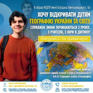 💬🧠 «Навчаючись у школі, я зрозумів: я можу викладати цікаві й важливі предмети — географію, біологію. А завдяки педагогіці — допомагати дітям знайти свій шлях. Я не хочу вчити когось “жити правильно” — я хочу навчити обирати свідомо, вільно, відповідально. Саме МДПУ імені Богдана Хмельницького допомагає мені втілювати цю мрію. На факультеті природничих наук, на кафедрі географії та туризму я знайшов не просто знання — я знайшов напрям, крила і віру».