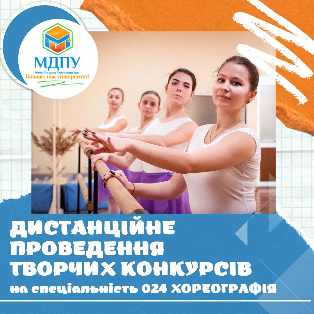 З 1 по 18 липня 2022 року дистанційне проведення творчих конкурсів для спеціальності 024 Хореографія для вступу на навчання за ступенем бакалавра на перший курс. Для участі в конкурсі треба заповнити заяву і надіслати разом з копією документа, що посвідчує особу (паспорт) на електронну адресу приймальної комісії pk-mdpu@ukr.net