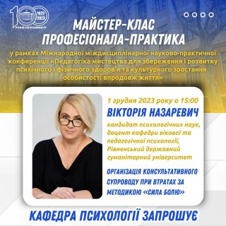 Міжнародної міждисциплінарної науково-практичної конференції «Педагогіка мистецтва для збереження і розвитку психічного і фізичного здоров’я та культурного зростання особистості впродовж життя» запрошує на майстер-клас професіонала-практика