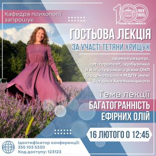 Кафедра психології МДПУ імені Богдана Хмельницького 16 лютого 2024 року о 12:45 запрошує здобувачів вищої освіти стати учасниками гостьової лекції на тему: