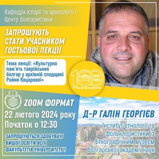 Кафедра історії та археології і Центр болгаристики МДПУ імені Богдана Хмельницького 22 лютого 2024 року о 12:30 запрошують здобувачів вищої всіх факультетів стати учасниками гостьової лекції на тему: