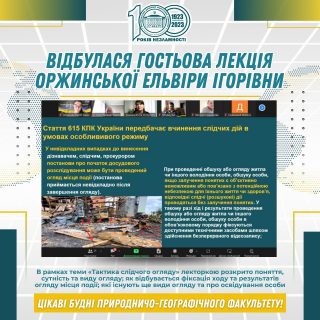 14 березня 2024 року на природничо-географічному факультеті МДПУ імені Богдана Хмельницького відбулася гостьова лекція Оржинської Ельвіри Ігорівни, кандидата юридичних наук, доцента кафедри професійних та спеціальних дисциплін херсонського факультету Одеського державного університету внутрішніх справ.