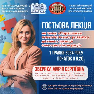 Кафедра психології МДПУ імені Богдана Хмельницького спільно з Глухівським національним педагогічним університетом імені Олександра Довженко запрошує стати учасником гостьової лекції на тему: «Порушення психологічного розвитку дитини з позиції сенсорної інтеграції».