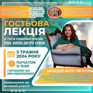 Кафедра психології МДПУ імені Богдана Хмельницького спільно з факультетом дошкільної освіти Глухівського національного педагогічного університету імені Олександра Довженко запрошує стати учасником гостьової лекції на тему: «ВІКОВІ ДИТЯЧІ КРИЗИ».