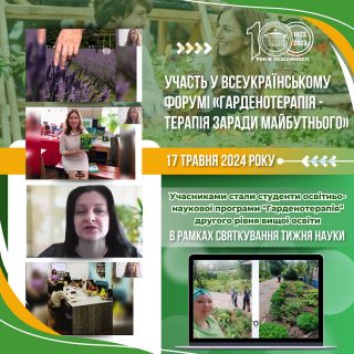 17 травня 2024 року в рамках святкування Тижня науки студенти освітньо-наукової програми “Гарденотерапія” другого (магістерського) рівня вищої освіти приймали участь у Всеукраїнському форумі “Гарденотерапія – терапія заради майбутнього».