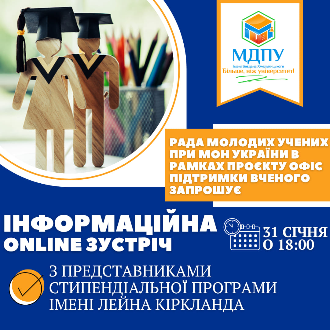 Рада молодих учених при Міністерстві освіти і науки України в рамках проєкту Офіс підтримки вченого запрошує до участі в інформаційній он-лайн зустрічі з представниками Стипендіальної Програми імені Лейна Кіркланда.