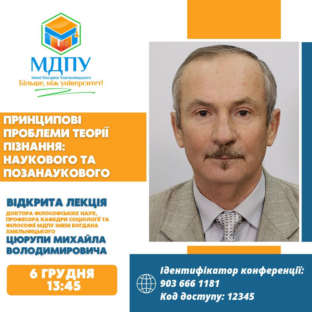 6 грудня о 13:45 (4 пара) відбудеться ВІДКРИТА ЛЕКЦІЯ доктора філософських наук, професора кафедри соціології та філософії МДПУ імені Богдана Хмельницького, ЦЮРУПИ МИХАЙЛА ВОЛОДИМИРОВИЧА.