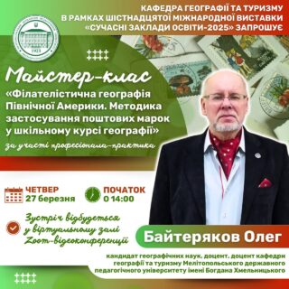 🌍✈️Кафедра географії та туризму Мелітопольського державного педагогічного університету імені Богдана Хмельницького в рамках Шістнадцятої міжнародної виставки «Сучасні заклади освіти-2025» запрошує стати учасником майстер-класу на тему: “Філателістична географія Північної Америки. Методика застосування поштових марок у шкільному курсі географії”