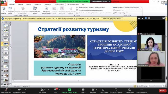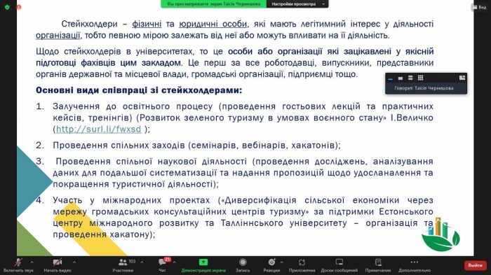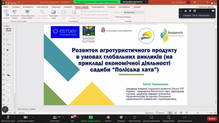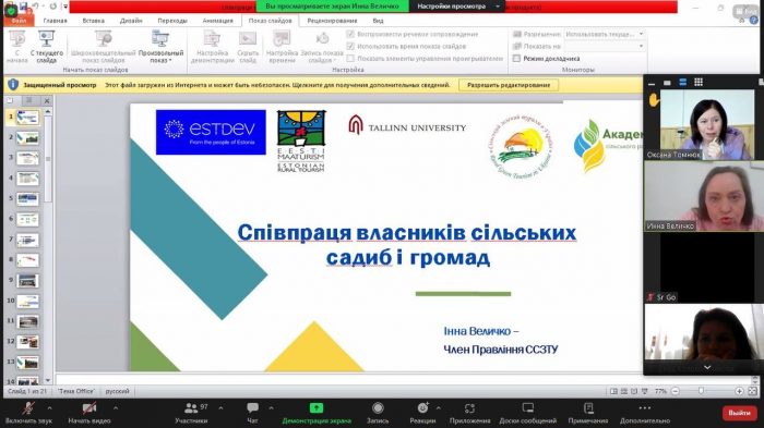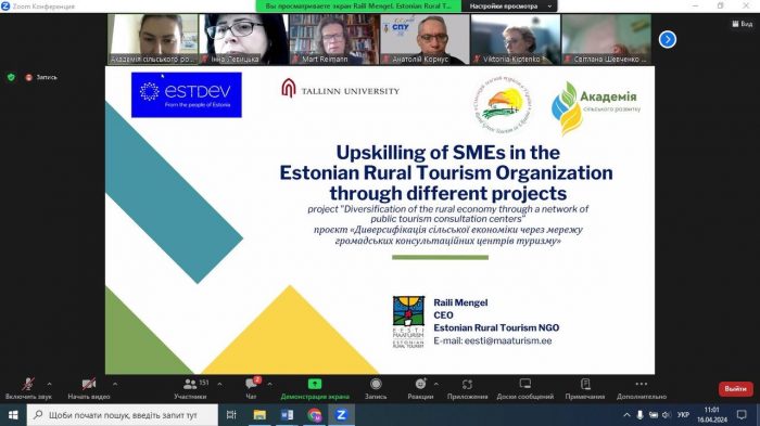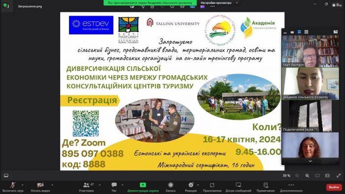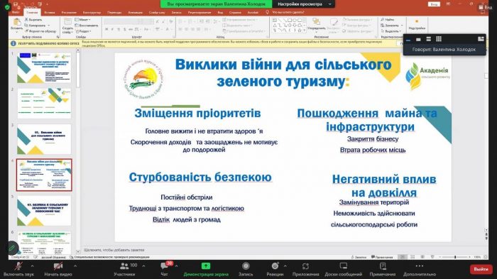 🧑🏻💻🇺🇦Модераторами тренінгової програми та учасниками заходу підіймались питання диверсифікації сільської економіки через мережу громадських консультаційних центрів туризму, обговорювались шляхи співпраці власників сільських садиб і громад, розглянуті можливі напрями створення сприятливих умов для здійснення туристичної діяльності на сільських територіях, одним з пріоритетних напрямів державної політики у сфері туризму в Україні визначено екологічний та сільський туризм, розвиток аграрного туризму визначено як засіб реалізації державної політики зайнятості населення.
