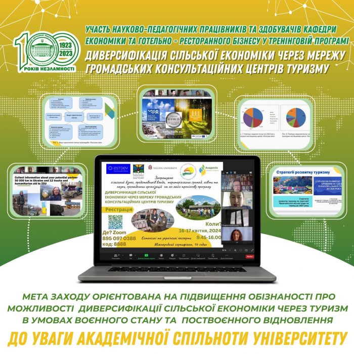 🗺️📊16-17 квітня 2024р. науково-педагогічні працівники та здобувачі кафедри економіки та готельно-ресторанного бізнесу прийняли участь у тренінговій програмі «Диверсифікація сільської економіки через мережу громадських консультаційних центрів туризму».