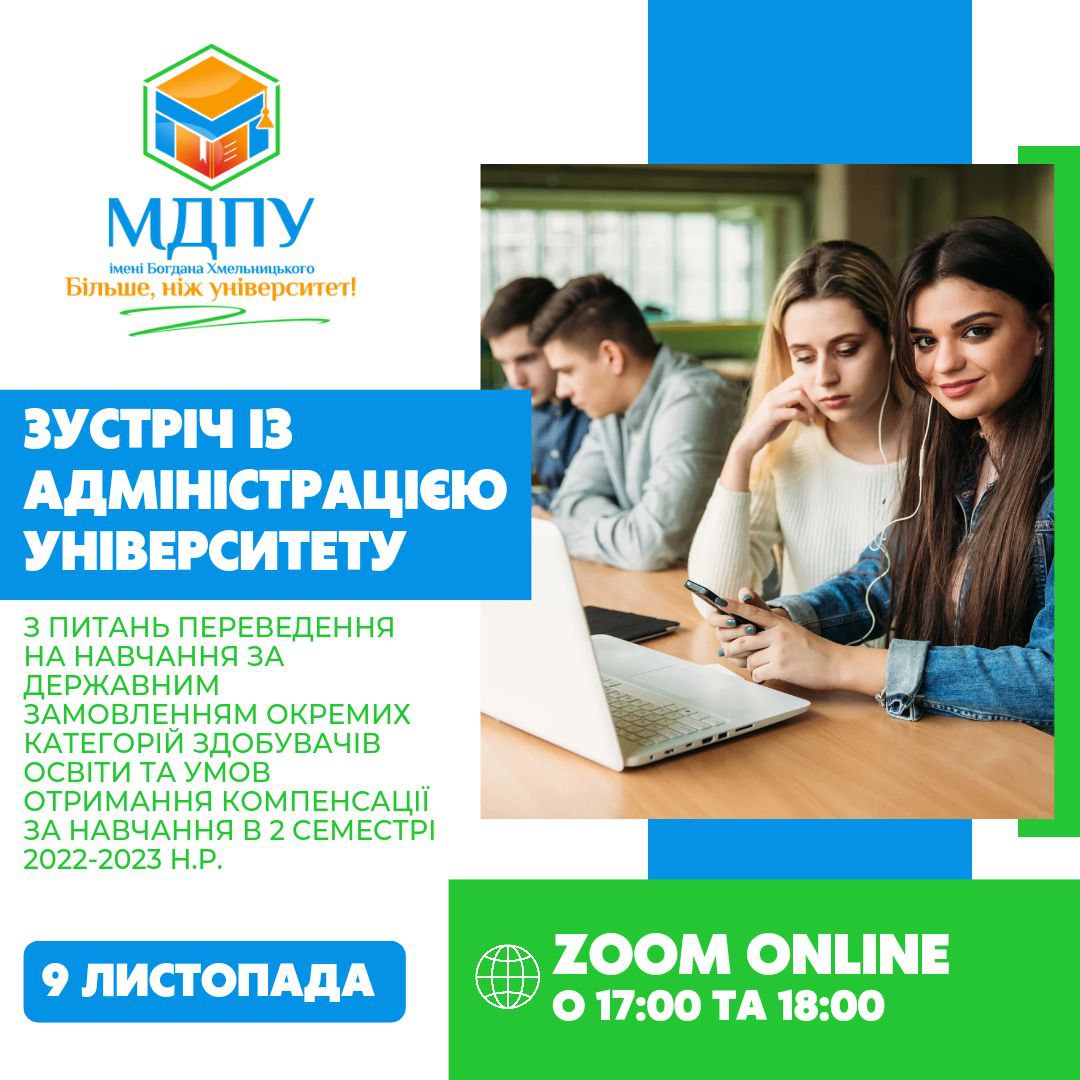 Адміністрація МДПУ імені Богдана Хмельницького запрошує приєднатися до зустрічі з питань переведення на навчання за державним замовленням окремих категорій здобувачів освіти та умов отримання компенсації за навчання в 2 семестрі 2021-2022 н.р.