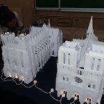 Анна Брянцева розповіла, що ці два красені-собори Олександр Брянцев вирізав і зібрав із звичайнісінького офісного паперу, єдиною особливістю якого є підвищена щільність, але зауважила, що, хай ущільнений, але це все одно папір, а не картон. «Картон не підійшов для нашого проекту через свою певну грубість», — зауважила Анна. Саме завдяки витонченості паперу вдалося передати ажурність готичних соборів, їх містичну експресію, довершені форми. Далі Олександр Брянцев продемонстрував, як спрощена модель Нотр-Дам, разом з моделями Ейфелевої вежі і Тріумфальної арки було використано в оформленні книги-іграшки «Мандруємо світом. Париж». Анна Брянцева звернулася до вчителів в аудиторії з пропозицією використовувати подібні техніки у роботі з учнями і розповіла, що вже є подібний досвід в процесі співпраці викладачів кафедри із учителями м. Мелітополя.