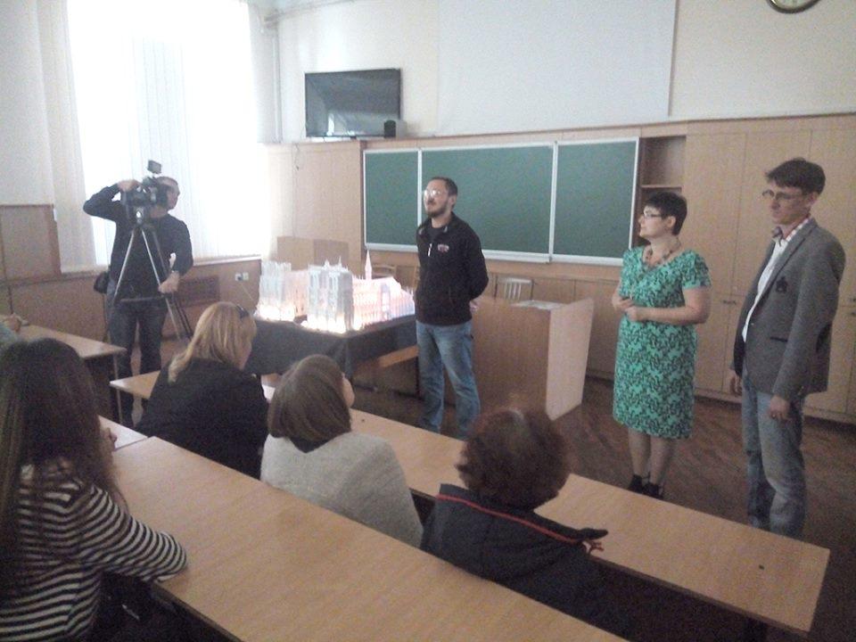 Відкрив презентацію завідуючий кафедрою інформатики і кібернетики Вячеслав Осадчий, який представив широкому загалу Олександра і Анну Брянцевих і Анну Чемерис. У своєму вступному слові професор охарактеризував їх не тільки як фахівців своєї справи, які ставлять перед собою творчі завдання і успішно їх реалізують, а й як людей, які «працюють і вдень і вночі» і «двомісячну відпустку розглядають насамперед як нагоду повністю «зануритися» у свій творчий проект», і все одно «шкодують, що на добу припадає лишень двадцять чотири години та жалкують, що відпустка у педагогів така коротка». Аудиторія по-доброму поставилася до представлення авторів і з нетерпінням почала очікувати на їх безпосередню розповідь, як вони створили ці паперові дива. А дивуватися гості презентації починали вже з моменту потрапляння у аудиторію. Адже вони, перш зайняти свої місця, мали пройти повз підсвічених м’яким розсіяним білим і загадковим мерехтливим кольоровим світлом два паперові собори — Реймсський і Нотр-Дам.