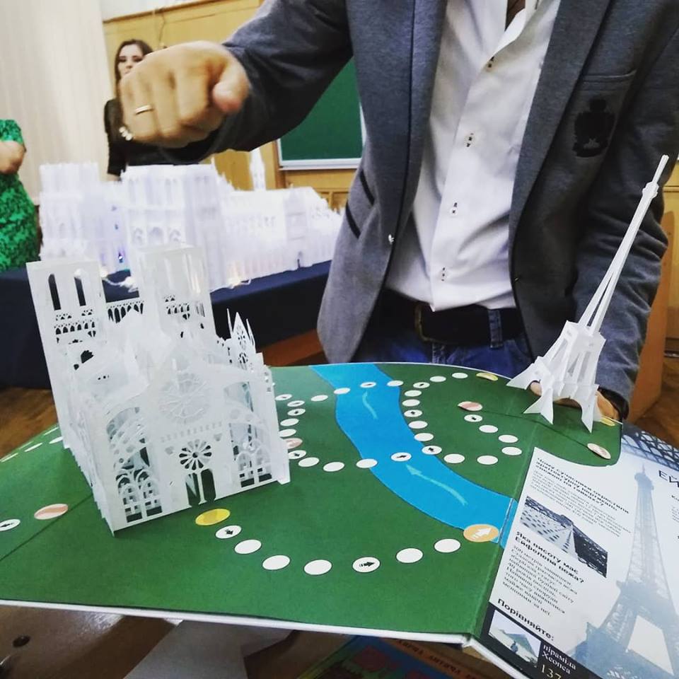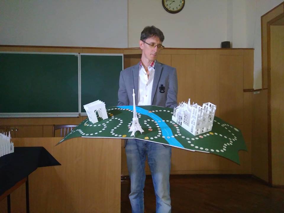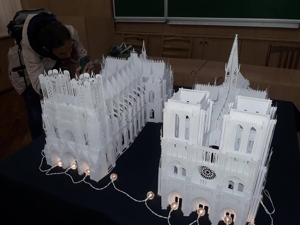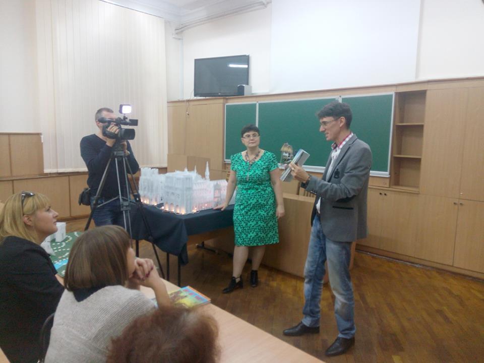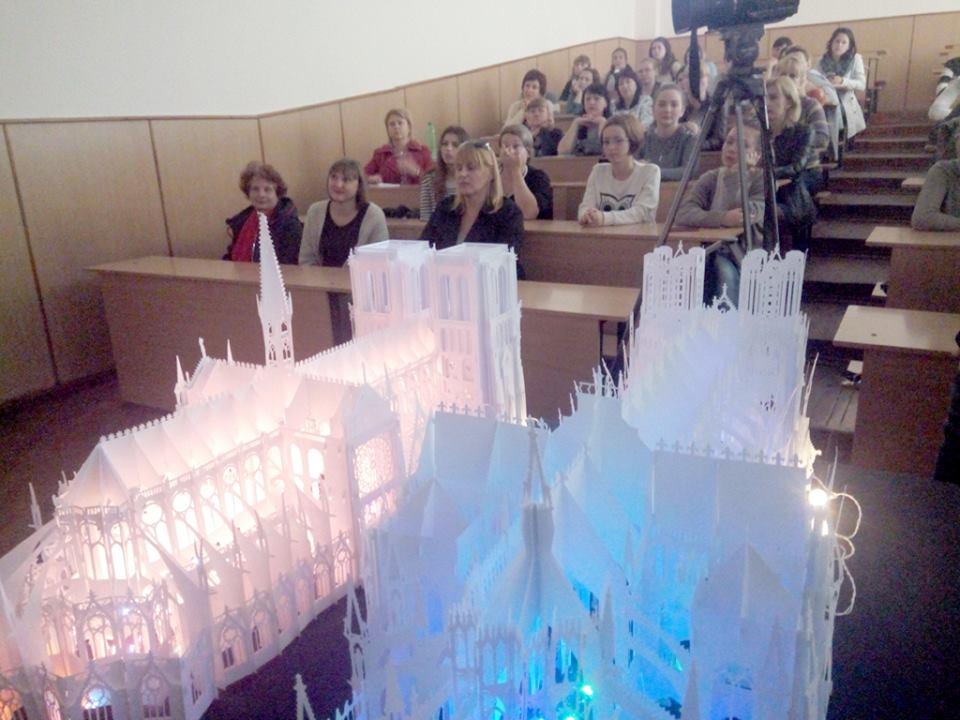 Анна Брянцева розповіла, що ці два красені-собори Олександр Брянцев вирізав і зібрав із звичайнісінького офісного паперу, єдиною особливістю якого є підвищена щільність, але зауважила, що, хай ущільнений, але це все одно папір, а не картон. «Картон не підійшов для нашого проекту через свою певну грубість», — зауважила Анна. Саме завдяки витонченості паперу вдалося передати ажурність готичних соборів, їх містичну експресію, довершені форми. Далі Олександр Брянцев продемонстрував, як спрощена модель Нотр-Дам, разом з моделями Ейфелевої вежі і Тріумфальної арки було використано в оформленні книги-іграшки «Мандруємо світом. Париж». Анна Брянцева звернулася до вчителів в аудиторії з пропозицією використовувати подібні техніки у роботі з учнями і розповіла, що вже є подібний досвід в процесі співпраці викладачів кафедри із учителями м. Мелітополя.