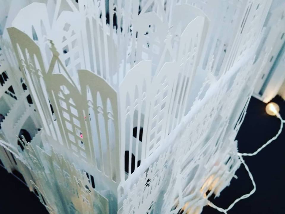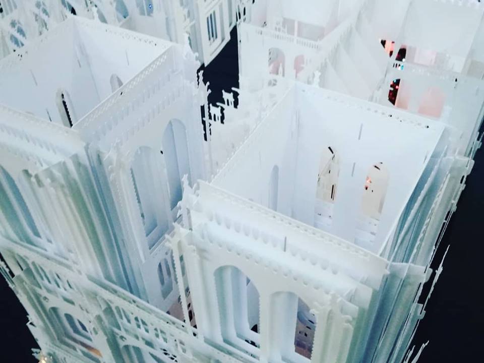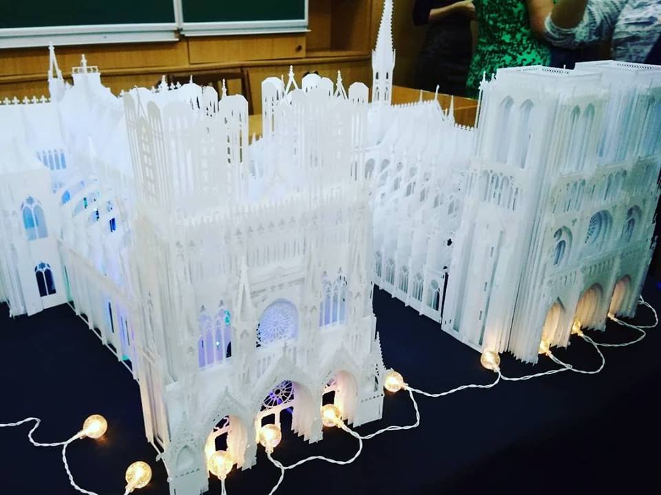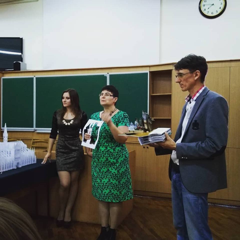 Анна Брянцева розповіла, що ці два красені-собори Олександр Брянцев вирізав і зібрав із звичайнісінького офісного паперу, єдиною особливістю якого є підвищена щільність, але зауважила, що, хай ущільнений, але це все одно папір, а не картон. «Картон не підійшов для нашого проекту через свою певну грубість», — зауважила Анна. Саме завдяки витонченості паперу вдалося передати ажурність готичних соборів, їх містичну експресію, довершені форми. Далі Олександр Брянцев продемонстрував, як спрощена модель Нотр-Дам, разом з моделями Ейфелевої вежі і Тріумфальної арки було використано в оформленні книги-іграшки «Мандруємо світом. Париж». Анна Брянцева звернулася до вчителів в аудиторії з пропозицією використовувати подібні техніки у роботі з учнями і розповіла, що вже є подібний досвід в процесі співпраці викладачів кафедри із учителями м. Мелітополя.