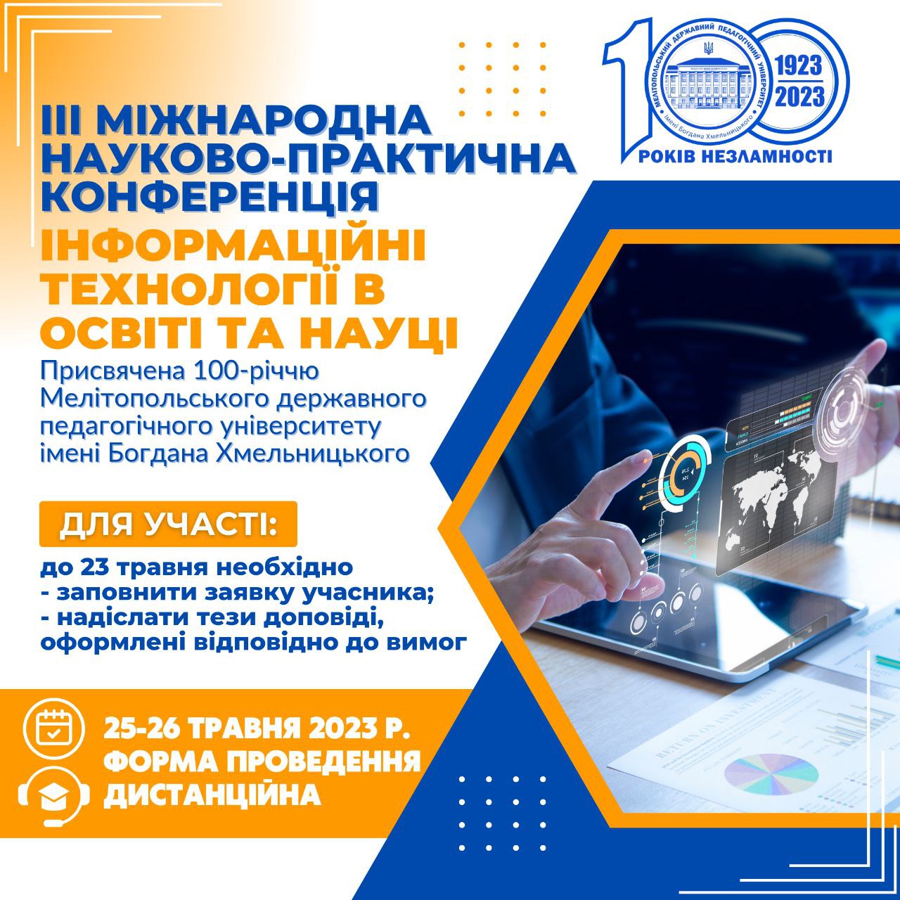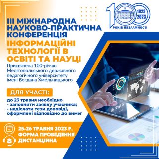 Факультет інформатики, математики та економіки МДПУ імені Богдана Хмельницького запрошує науково-педагогічних працівників, аспірантів, докторантів, здобувачів вищої освіти та всіх зацікавлених осіб взяти участь у ІІІ Міжнародній науково-практичній конференції «Інформаційні технології в освіті та науці».