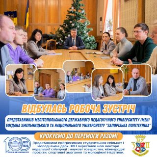 Сьогодні, 23 січня 2024 року, відбулась робоча зустріч представників Мелітопольського державного педагогічного університету імені Богдана Хмельницького та Національного університету “Запорізька політехніка”.