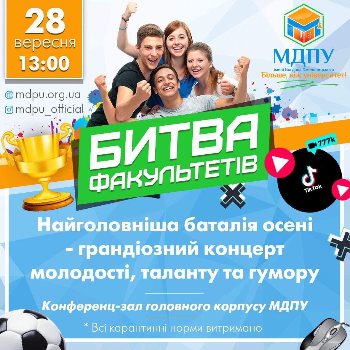 Вер282021Новини університету ГОЛОВНА БАТАЛІЯ ОСЕНІ 🔥🍂🎓 Настав час молодості, таланту та гумору! Прийшла пора дізнатися імена головних переможців 🏆🎉 Вже завтра, о 13.00, конференц-зал університету. НАЙКРАЩІ ПЕРШОКУРСНИКИ ЧЕКАЮТЬ НА ВАШУ ПІДТРИМКУ! ❤️👍 Post Views: 57 Category: Новини університетуВід mdpu_supervisor28.09.2021 Author: mdpu_supervisor Post navigationПопереднійПопередній пост:ДЕНЬ МІСТА МNextNext post:Відкрита лекція-зустріч з мелітопольською письменницею-казкаркою Наталею МацієвськоюRelated PostsМІЖНАРОДНИЙ ДЕНЬ ЗАПОБІГАННЯ ЕКСПЛУАТАЦІЇ НАВКОЛИШНЬОГО СЕРЕДОВИЩА ПІД ЧАС ВОЄННИХ І ЗБРОЙНИХ КОНФЛІКТІВ06.11.2025УСПІШНИЙ СТАРТ В АСПІРАНТУРІ: РЕКОМЕНДАЦІЇ ЩОДО СКЛАДАННЯ ІНДИВІДУАЛЬНОГО ПЛАНУ06.11.2025МРІЙ. ДІЙ. ПЕРЕМАГАЙ РАЗОМ З МДПУ!06.11.2025ЗАПРОШУЄМО ВЗЯТИ УЧАСТЬ У РОБОТІ КОНФЕРЕНЦІЇ!06.11.2025ВОРКШОП “ІДЕЇ ДЛЯ УРОКІВ МАЙБУТНЬОГО” — ОСВІТНІЙ ПРОСТІР ІННОВАЦІЙ ТА ПРОФЕСІЙНОГО ЗРОСТАННЯ!05.11.2025ВІТАЄМО З ПЕРЕМОГОЮ!05.11.2025