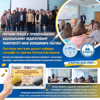 👨🏼🏫🌍 9 квітня 2025 року доцентом кафедри географії та туризму Олегом Байтеряковим було проведеногостьову лекцію на кафедрі географії та методики її навчання Тернопільського національногопедагогічного університету імені Володимира Гнатюка в рамках освітнього компоненту «Картографія».