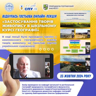 🏛️📚23 жовтня 2024 року на кафедрі загальної та регіональної географії природничо-географічного факультету Сумського державного педагогічного університету імені А.С. Макаренка доцентом кафедри географії та туризму Мелітопольського державного педагогічного університету імені Богдана Хмельницького О. Байтеряковим було прочитано гостьову онлайн-лекцію на тему:🖼️🗺️«Застосування творів живопису в шкільному курсі географії».