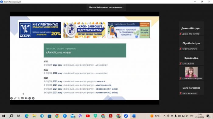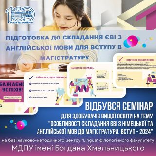 27 березня 2024 року на філологічному факультеті на базі науково-методичного центру “Lingua” та згідно з планом роботи комісії з розвитку іншомовної освіти університету відбувся семінар для здобувачів вищої освіти на тему “Особливості складання ЄВІ з німецької та англійської мов до магістратури. Вступ – 2024”.