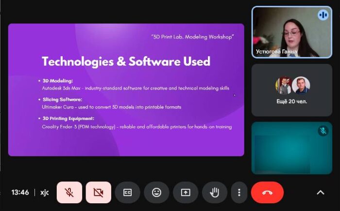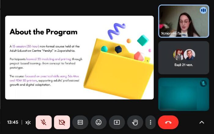 🇺🇦🙋🏻♀️ 14 травня 2025 року Ганна УСТЮГОВА, здобувачка вищої освіти другого (магістерського) рівня освітньої програми “Професійна освіта. Цифрові технології”, авторка і тренерка курсів з 3D-моделювання і цифрового дизайну, представила результати наукового дослідження «Розробка тренінгового курсу «3D Print Lab. Майстерня моделювання» для формування STEAM-навичок у дорослих» на 4th Yurii Ramskyi STE(A)M Workshop.
