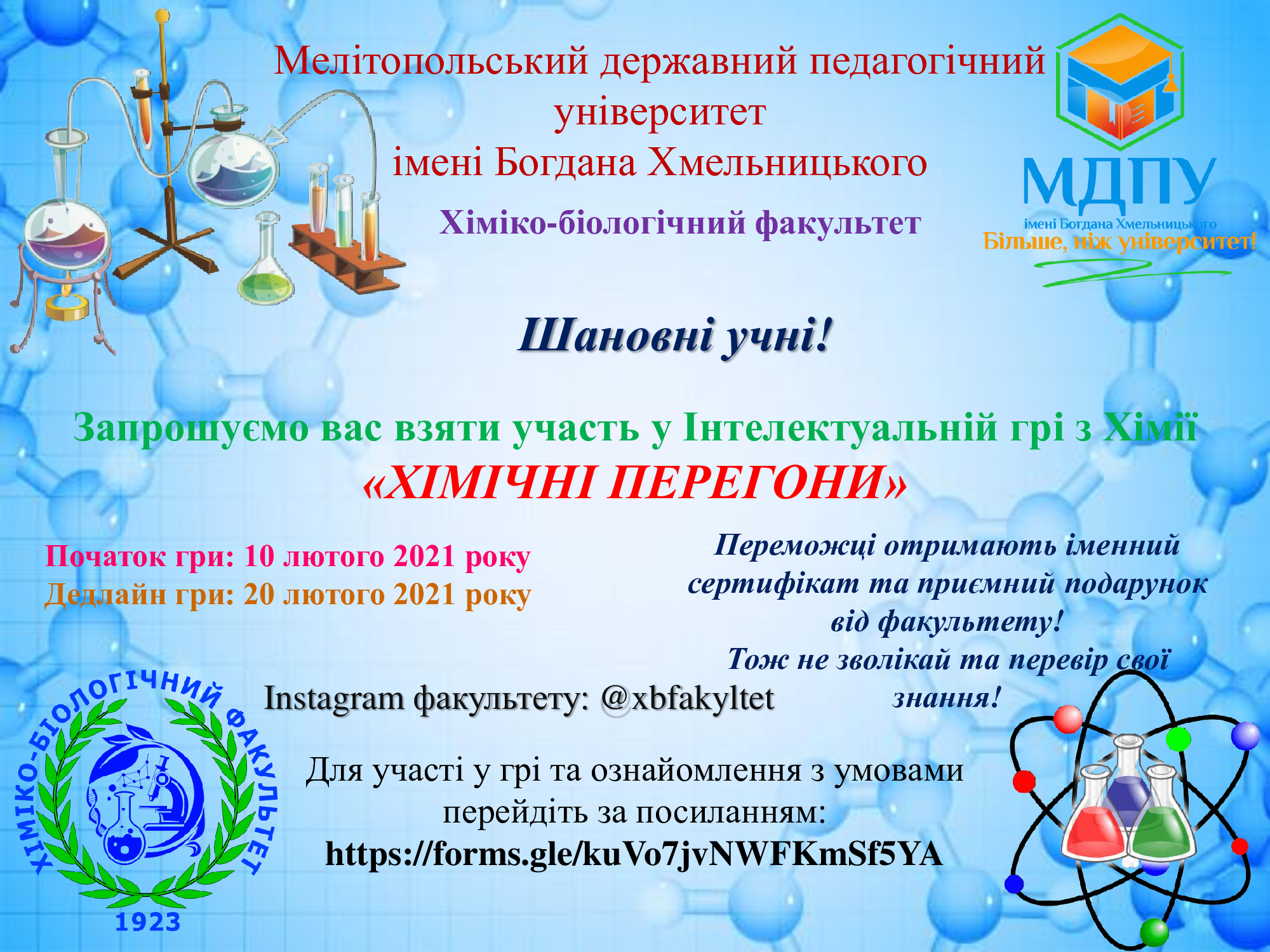 Лют102021Новини університету Хіміко-біологічний факультет і студентська рада факультету запрошують учнів старших класів взяти участь у інтелектуальній грі з хімії «Хімічні перегони» Для участі у грі та ознайомлення з умовами перейдіть за посиланням: https://forms.gle/kuVo7jvNWFKmSf5YA Post Views: 103 Category: Новини університетуВід mdpu_supervisor10.02.2021Leave a comment Author: mdpu_supervisor Post navigationПопереднійПопередній пост:Доцентом кафедри економіки та готельно-ресторанного бізнесу Верховод І.С. проведено Zoom-конференцію «Чому і як здобувач вищої освіти може впливати на якість освітньої програми?»NextNext post:На кафедрі ботаніки і садово-паркового господарства відбувся передзахист робіт на здобуття наукового ступеня кандидата біологічних наукRelated PostsМІЖНАРОДНИЙ ДЕНЬ ЗАПОБІГАННЯ ЕКСПЛУАТАЦІЇ НАВКОЛИШНЬОГО СЕРЕДОВИЩА ПІД ЧАС ВОЄННИХ І ЗБРОЙНИХ КОНФЛІКТІВ06.11.2025УСПІШНИЙ СТАРТ В АСПІРАНТУРІ: РЕКОМЕНДАЦІЇ ЩОДО СКЛАДАННЯ ІНДИВІДУАЛЬНОГО ПЛАНУ06.11.2025МРІЙ. ДІЙ. ПЕРЕМАГАЙ РАЗОМ З МДПУ!06.11.2025ЗАПРОШУЄМО ВЗЯТИ УЧАСТЬ У РОБОТІ КОНФЕРЕНЦІЇ!06.11.2025ВОРКШОП “ІДЕЇ ДЛЯ УРОКІВ МАЙБУТНЬОГО” — ОСВІТНІЙ ПРОСТІР ІННОВАЦІЙ ТА ПРОФЕСІЙНОГО ЗРОСТАННЯ!05.11.2025ВІТАЄМО З ПЕРЕМОГОЮ!05.11.2025