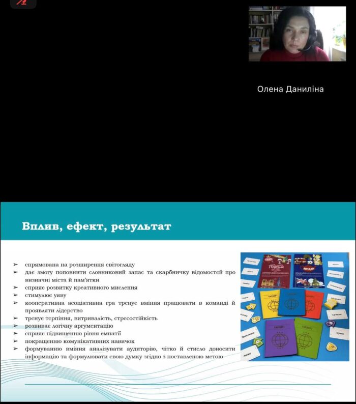 🙋🏻♀️⭐️ Лекторка поділилася власним досвідом інтеграції ігор у навчання студентів з метою підвищення залученості, розвитку творчого мислення та формування практичних навичок; розповіла про різні типи ігор, які можуть бути застосовані в освітньому процесі, зокрема рольові, сюжетно-тематичні, психологічні та інтерактивні ігри.