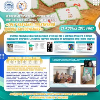 🙋🏻♀️⭐️ Лекторка поділилася власним досвідом інтеграції ігор у навчання студентів з метою підвищення залученості, розвитку творчого мислення та формування практичних навичок; розповіла про різні типи ігор, які можуть бути застосовані в освітньому процесі, зокрема рольові, сюжетно-тематичні, психологічні та інтерактивні ігри.