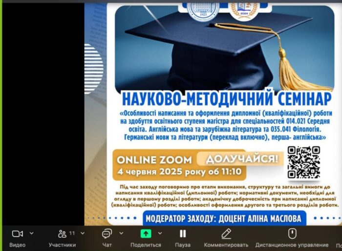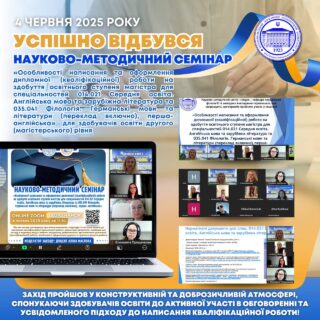 👩🏻🎓🏛️ 4 червня 2025 року викладачі кафедри германської філології та методики викладання германських мов Мелітопольського державного педагогічного університету імені Богдана Хмельницького провели науково-методичний семінар «Особливості написання та оформлення дипломної (кваліфікаційної) роботи на здобуття освітнього ступеня магістра для спеціальностей 014.021 Середня освіта. Англійська мова та зарубіжна література та 035.041 Філологія. Германські мови та літератури (переклад включно), перша- англійська» для здобувачів освіти другого (магістерського) рівня.