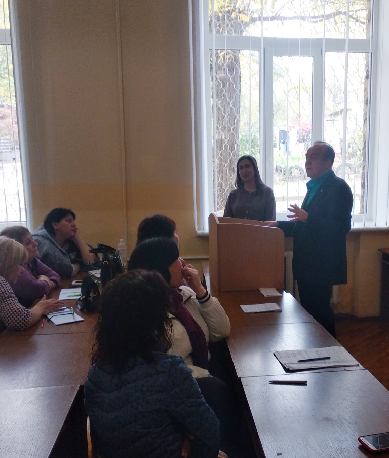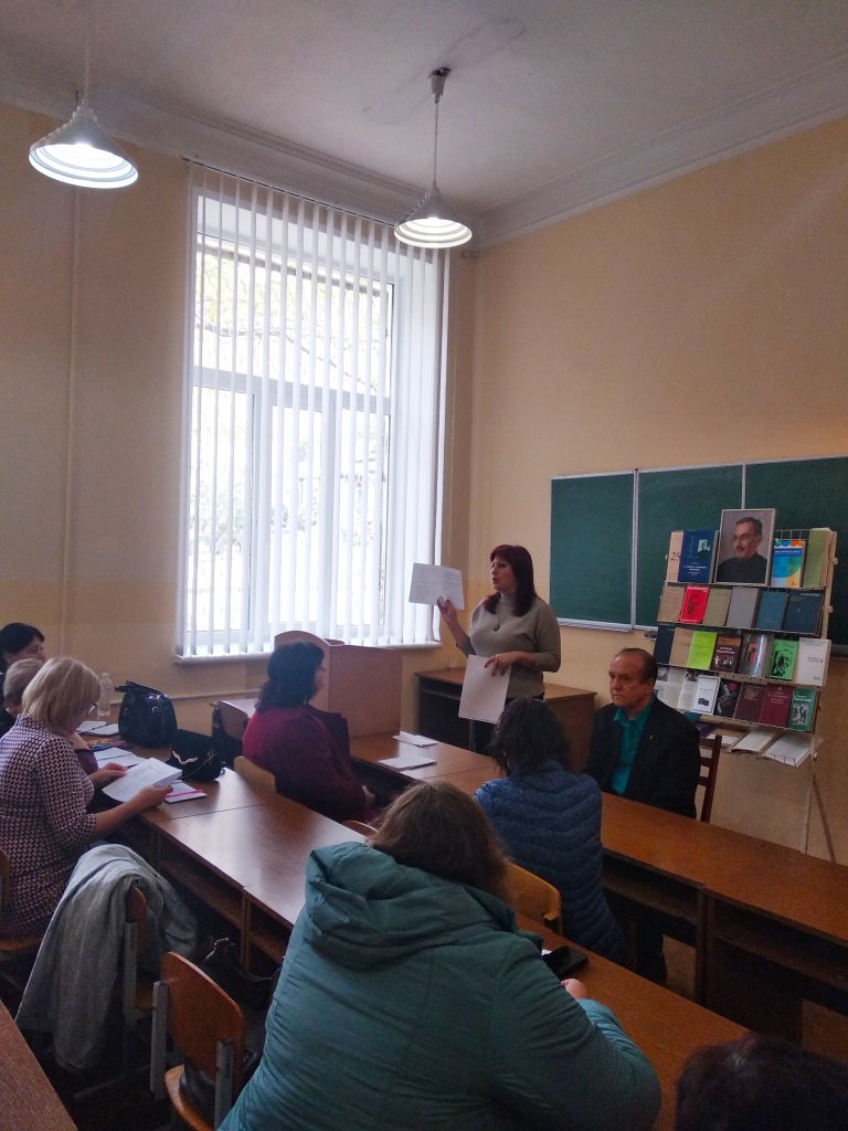 Доцент Єрмак Ю.І. запропонувала присутнім презентацію на тему: «Педагогічна діяльність А. С. Макаренка», де було представлено змістовний матеріал про життя та діяльність педагога. Підкреслено, що твори видатного педагога є цінним джерелом для кожного сучасного педагога. Також доц. Єрмак Ю.І. провела анкетування присутніх учителів.