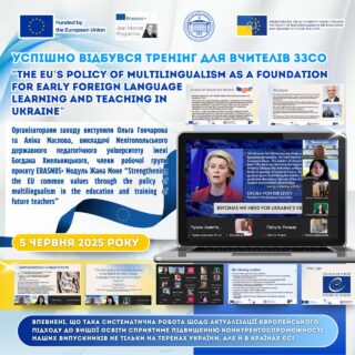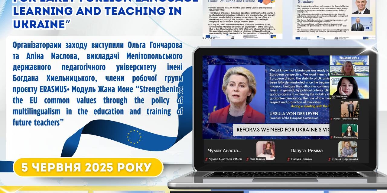 🌐📚 5 червня 2025 року Ольга Гончарова та Аліна Маслова, викладачі Мелітопольського державного педагогічного університету імені Богдана Хмельницького, члени робочої групи проєкту ERASMUS+ Модуль Жана Моне “Strengthening the EU common values through the policy of multilingualism in the education and training of future teachers” (Project Jean Monnet 101083321 – SEUCV ETT – ERASMUS-JMO-2022-HEI-TCH-RSCH) провели Тренінг для вчителів ЗЗСО “The EU’s policy of multilingualism as a foundation for early foreign language learning and teaching in Ukraine”, який було присвячено обговоренню актуальних питань функціонування Ради Європи, її цілей та завдань.