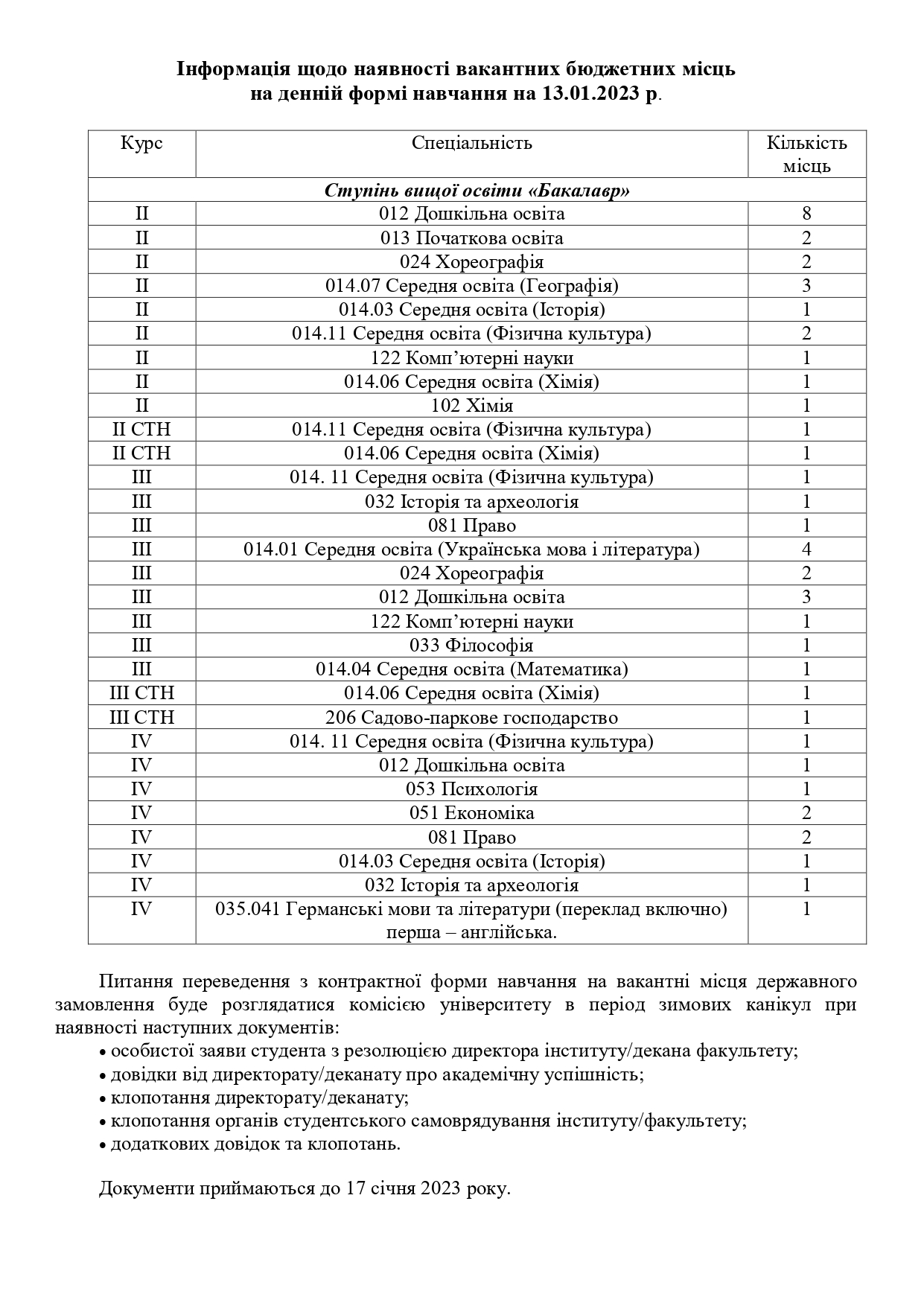 Інформація щодо наявності вакантних бюджетних місць на денній формі навчання на 13.01.2023 р.