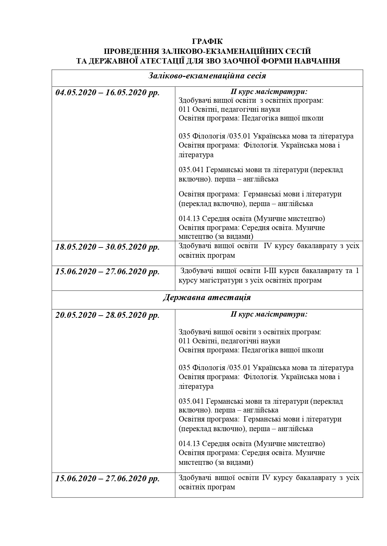 Для бакалаврів та магістрів з підготовки освітніх програм «фізична культура», «мова і література (англійська»), «мова і література (німецька)» (магістратура), «філологія. Германські мови», «біологія», «екологія», «освітні педагогічні науки», «менеджмент», «психологія», «соціальна робота», хімія, економіка, готельно-ресторанна справа, початкова освіта (бакалаврат)- навчальні заняття будуть проведені з 21.04. по 30.04.2020 р.