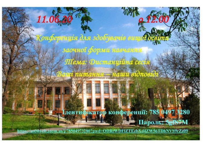 Заліково-екзаменаційна сесія у період з 2 листопада до 14 листопада 2020р. відбудеться у змішаному режимі: лекції та практичні заняття виключно з використанням дистанційних технологій навчання; заліки та іспити – аудиторно з дотриманням санітарно-гігієнічних вимог та дистанційно, для тих, хто не має можливості приїхати до університету (хворі, на самоізоляції, перебування у «червоній» зоні тощо).